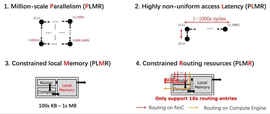 Figure 3: The PLMR model, which captures the key architectural traits of wafer-scale systems and outline the main challenges for software developers.
