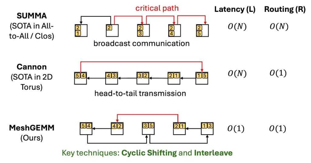 As shown in Figure 5(a), MeshGEMM addresses the Latency (L) and Routing (R) challenges by using cyclic shifting and interleaving to construct the shortest possible communication paths. Compared with state-of-the-art GEMM algorithms optimised for Clos or Torus topologies, MeshGEMM reduces communication overhead by 2-5× on mesh networks, leading to 1.3-2× end-to-end GEMM speedups.