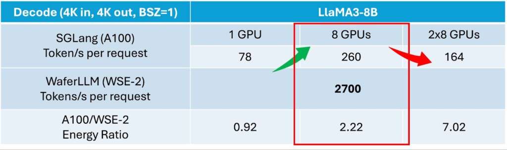 Figure 6: Scaling efficiency comparison for wafer-scale and multi-GPU systems. For LlaMA3-8B decoding, the wafer-scale system (WSE-2) achieves 2,700 tokens/s, significantly outperforming an 8-GPU A100 server (260 tokens/s). The world-record results highlight the wafer-scale system’s superior performance and its improved energy efficiency at scale, avoiding the communication bottlenecks of multi-chip setups.